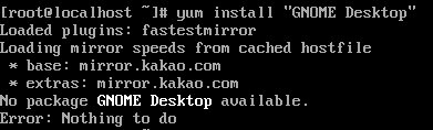 yum install "GNOME Desktop" 명령을 통해 설치를 한다고 했는데 mirror.kako.com 연결을 안 시켜서 접근을 할 수 없다고 한다. ISO파일에 저 파일이 없기 때문에 에러가 발생했으니 centos 네트워크에 접속할 수 있도록 설정을 해 줘야한다.