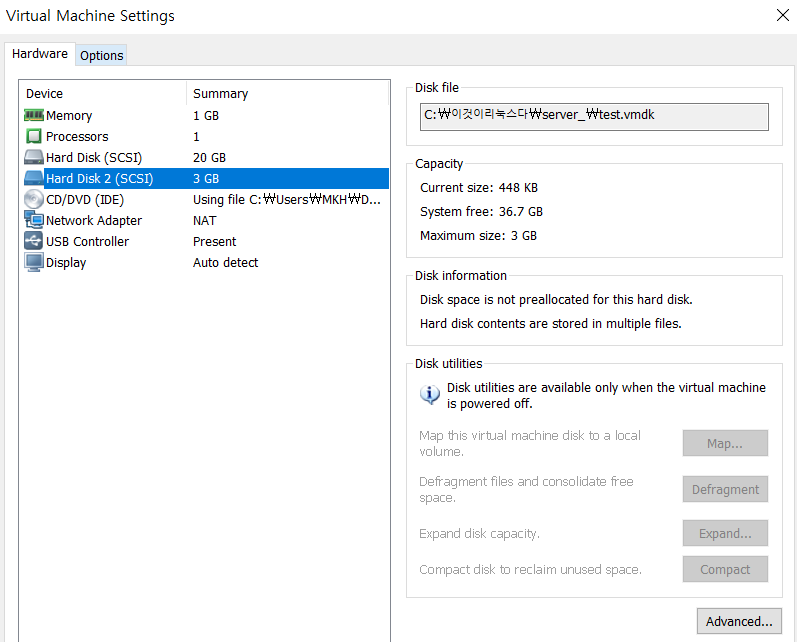 VMware에서 하드웨어 명칭을 sda ,sdb ,sdc, sdd ... 정의를 해두었다. 처음에 20GB 하드 명칭은 sda 이고