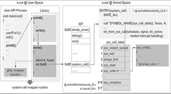 다음으로 0x80을 인자로 트랩(trap)을 걸게 됩니다. 커널은 트랩 번호인 0x80(Intel CPU에서...)을 IDT(Interrupt Descriptor Table)에 검색하여 이에 해당하는 system_call()을 엔트리(ENTRY)에서 호출합니다. 이 함수는 eax(=4) 값을 index로 sys_call_table을 탐색합니다. 현재 eax register에 들어있는 4값으로 sys_write의 포인터 값을 받아 sys_write()함수를 호출하게 됩니다.
