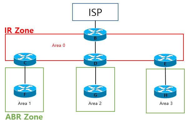 Area 0 라우터들은 외부와 연결이 되어 있고, Area1 ,Area2 ,Area3라우터는 Area 0영역과 연결이 되어있다.