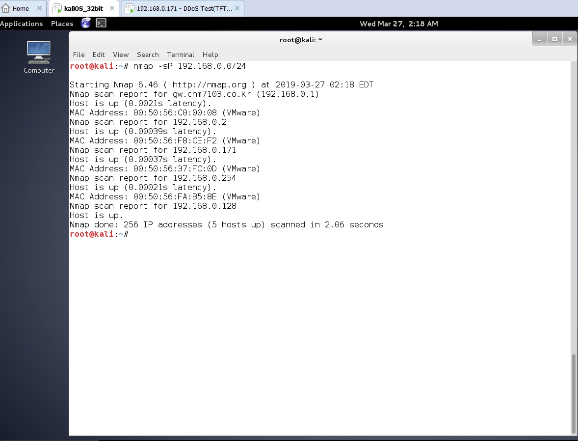 칼리에서 nmap -sP 192.168.0.0/24 명령어를 통해