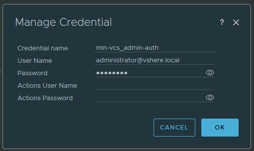 Credential Name : 개인이 정의 / User Name : vCenter에 인증할 계정 / Password : 인증 계정 Password
