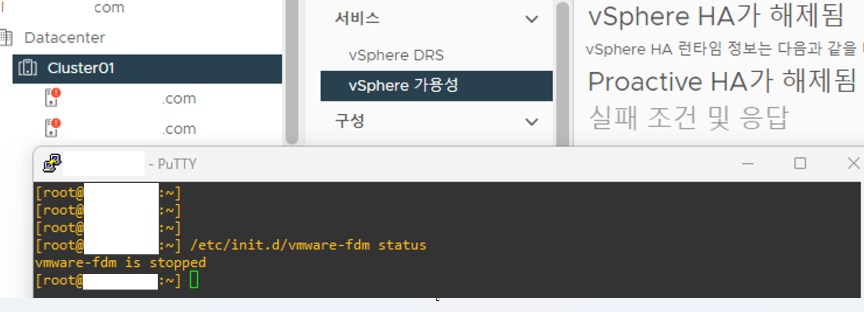 HA 클러스터 생성 → vCenter에서 HA Agent가 ESXi 설치 ( /etc/init.d/vmware-fdm) → HA 구성 후 vCenter에서 관리하지 않음, 또한 vCenter에서 장애 발생 시 클러스터 영향 없음