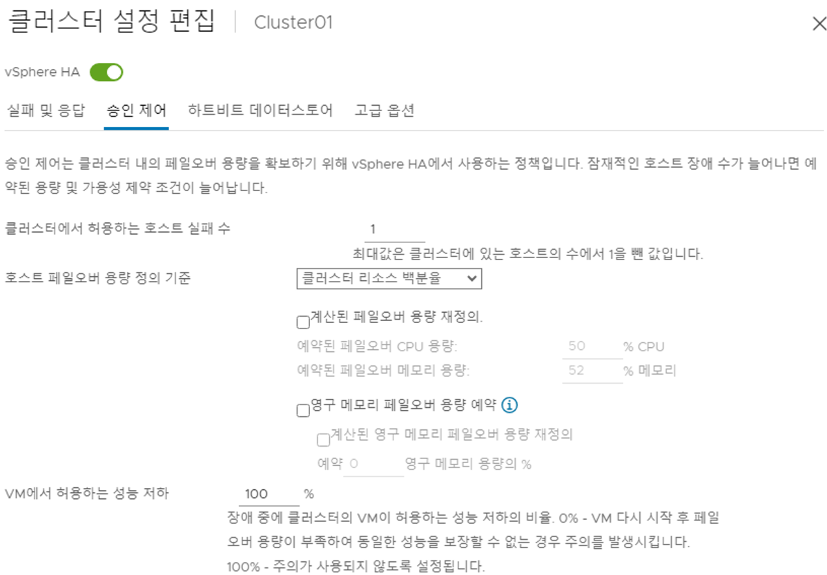 승인 제어는 페일오버 용량을 확보하기 위해 vSphere HA에서 사용하는 정책이다. Host의 장애 수에 따라 비율을 산정을 해서 사용할 리소스를 미리 할당을 한다. VMware Docs에서는 1대기 기준으로 산정이 되어 있다. 실제로 1,2,3대씩 증가 될때마다 예약된 리소스가 각기 다르며, 1/n 형식을 유지하다가 어느 지점에 가면 특정 수치로 고정이 되어있다.