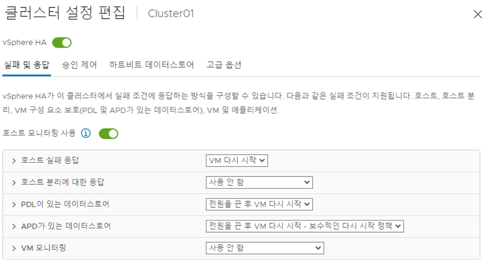 클러스터에서 HA를 활성화 상태이다. vSphere HA 활성화 상태이며, Proactive HA는 비활성화 한 상태이다.