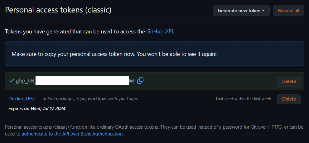 Write:packages / Read:packages / Delete:Packages 총 3개의 패키지 권한 부여
