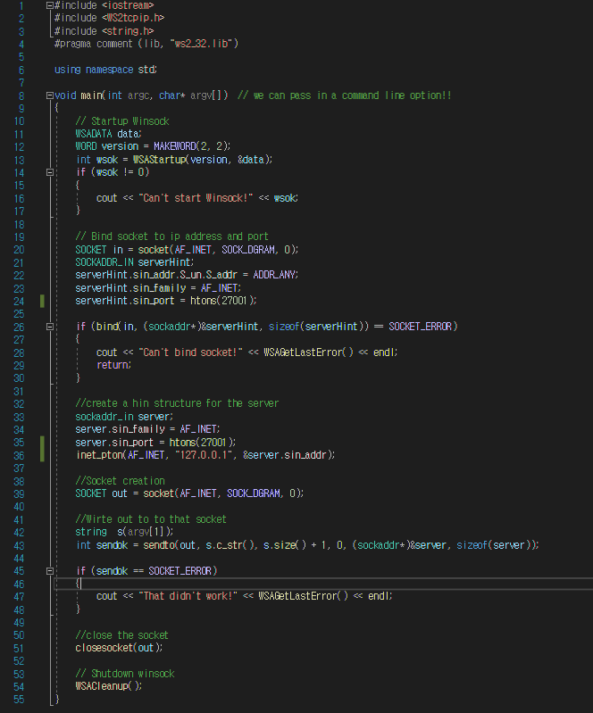 #praga comment (lib , "ws2_32.lib") 를 통해 lib파일 사용한다고 명시.