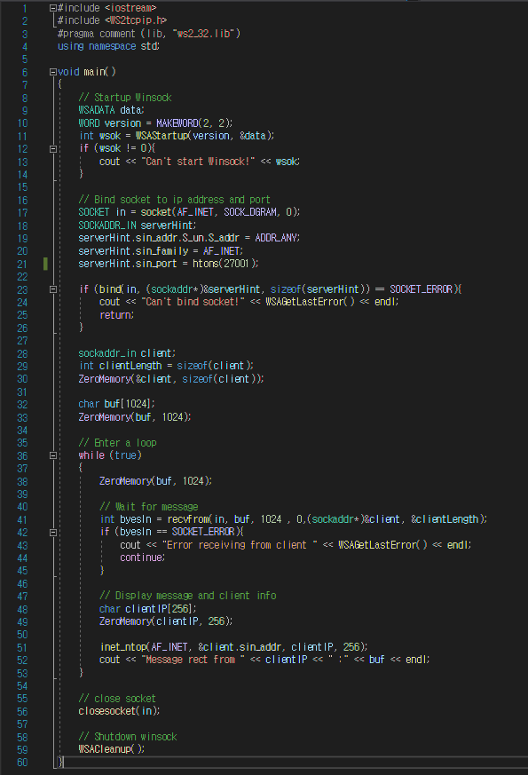 소켓(IPv4 , UDP , 0 ) = IP (ADDR_ANY) + Port (27001)